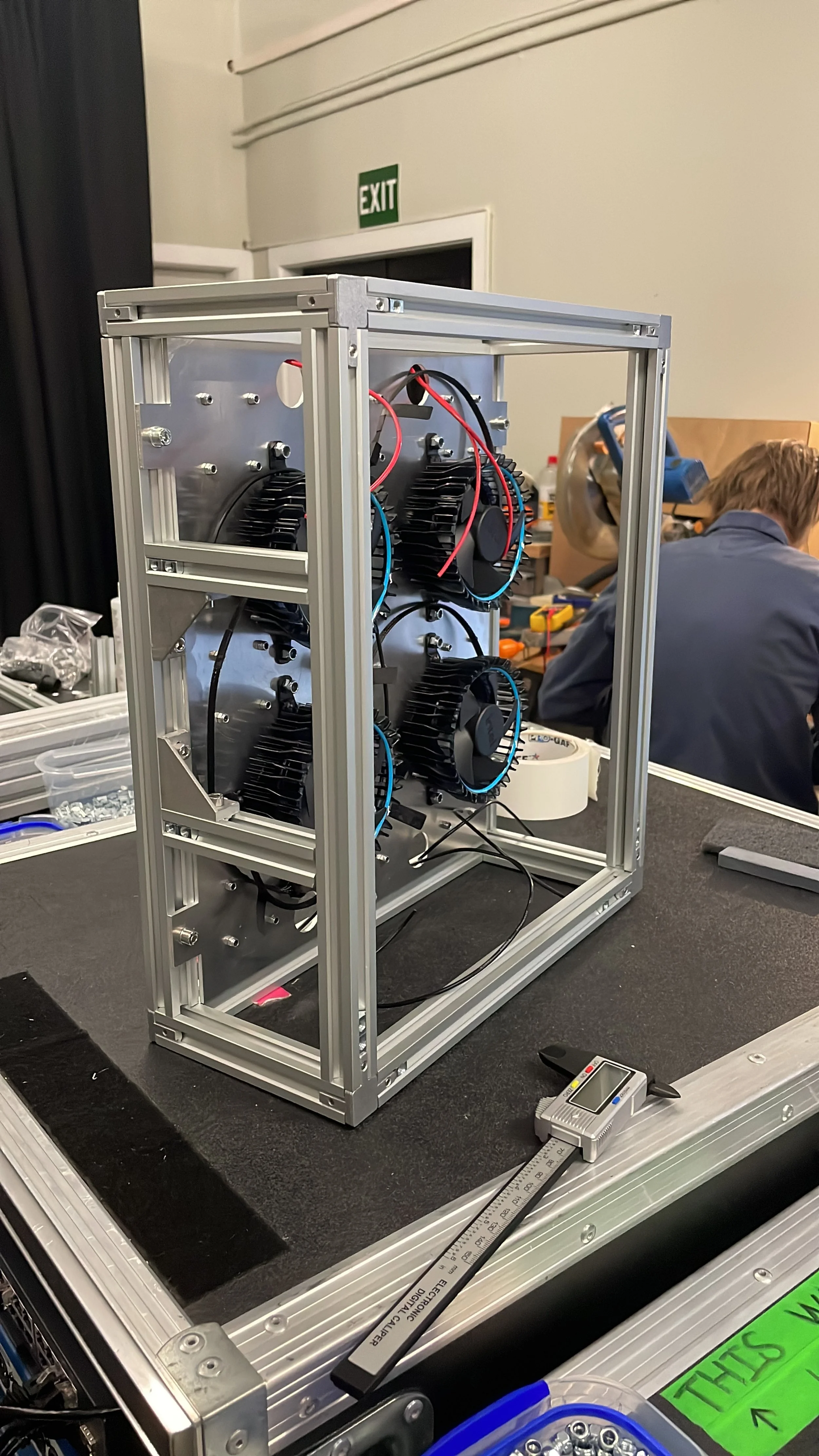With a combination of 30w IR LEDs, laser cut aluminum, extrude, 3D printing, intel PC fans and a bunch of misc parts we built 6x 270w IR floods to light our backdrop.